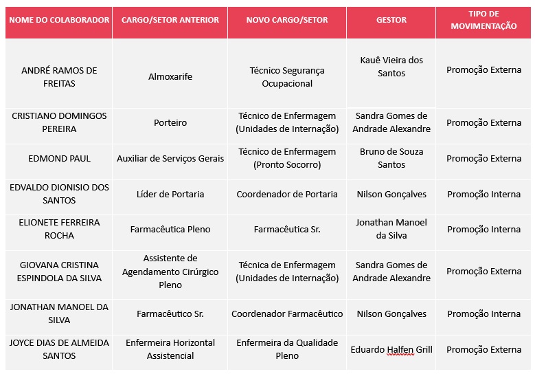 Aqui, no Alvarenga Conecta, você sempre poderá conferir as movimentações de colaboradores do Hospital Dom Alvarenga: promoções, efetivações e mudanças de setor.